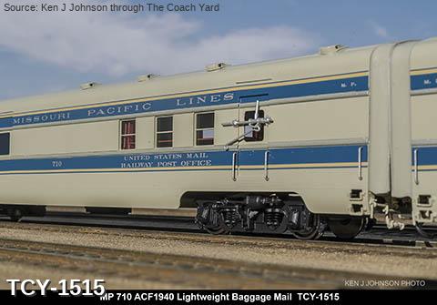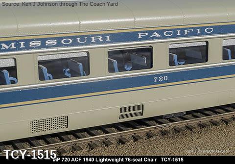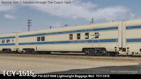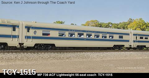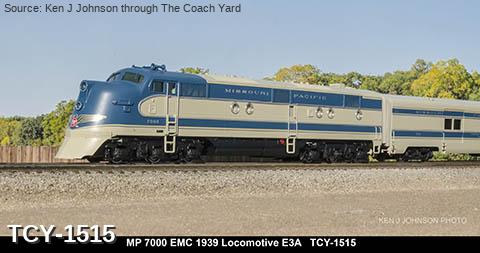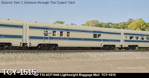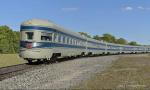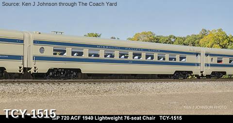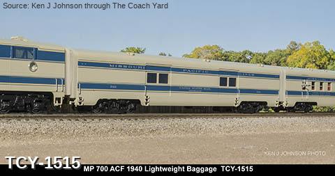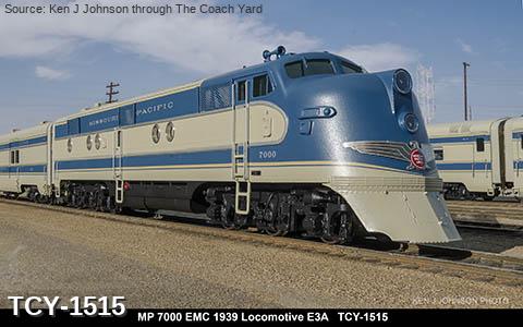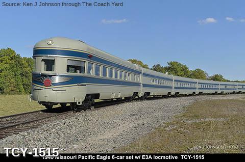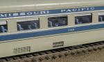 MP 'Eagle' LW 6 car train w/ Engine, 1940 era, ACF built: Baggage #700, Baggage-Mail #710, Coach #720, 76 seat, Coach #730, 56 Seat, Diner-Bar-Lounge #740, Parlor Observation #750, EMD E3A #7000, FP Blue / Gray, LTD, LT, INT