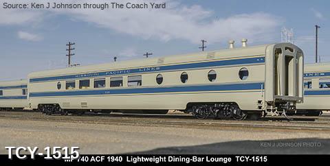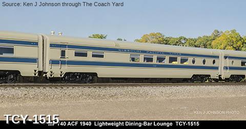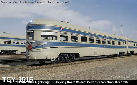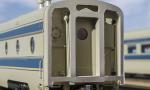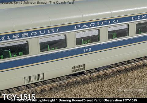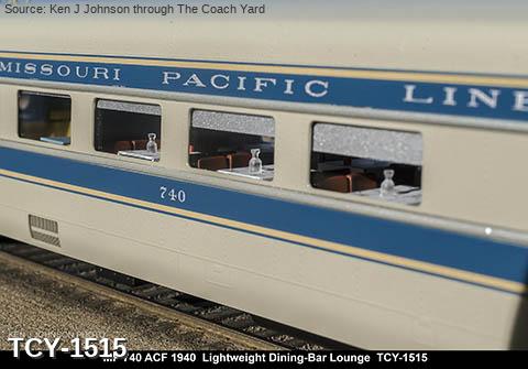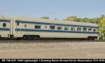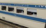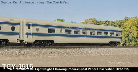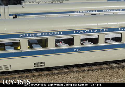 MP 'Eagle' LW 6 car train w/ Engine, 1940 era, ACF built: Baggage #700, Baggage-Mail #710, Coach #720, 76 seat, Coach #730, 56 Seat, Diner-Bar-Lounge #740, Parlor Observation #750, EMD E3A #7000, FP Blue / Gray, LTD, LT, INT