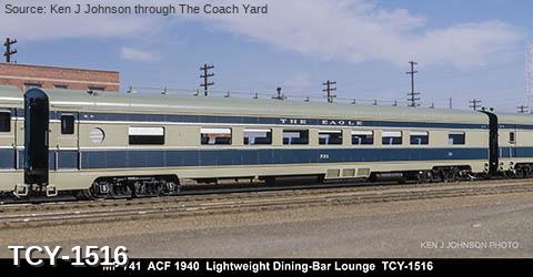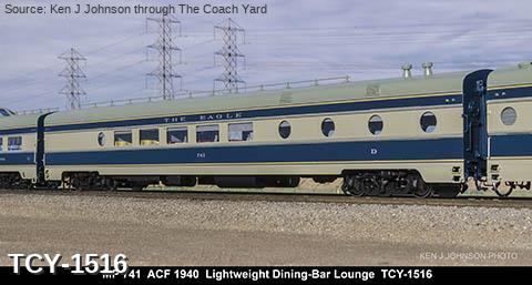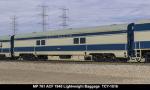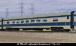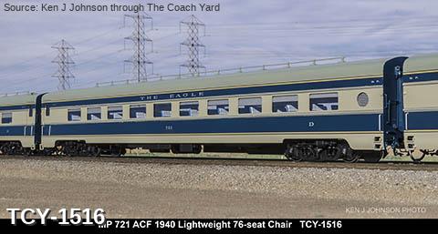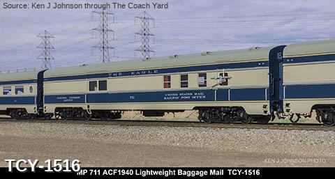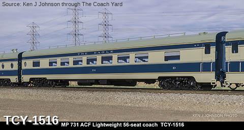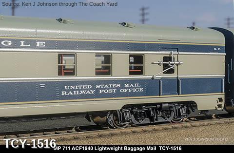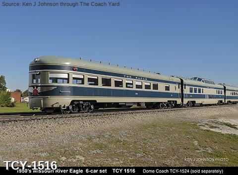 MP 'Missouri River Eagle' LW 6 car train, 1950s era, ACF built: Baggage #701, Baggage-Mail #711, Coach #721, 76 seat, Coach #731, 56 Seat, Diner-Bar-Lounge #741, Parlor Observation #751, FP Blue / Gray, LTD, INT NOTE: No engine