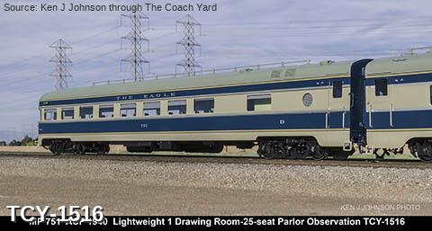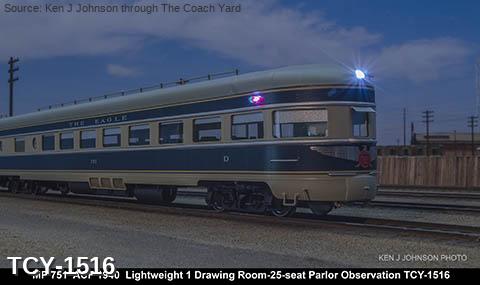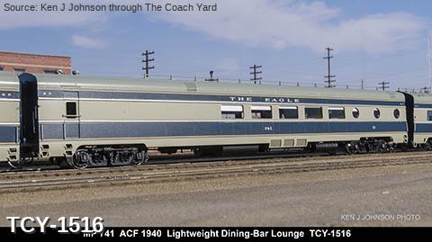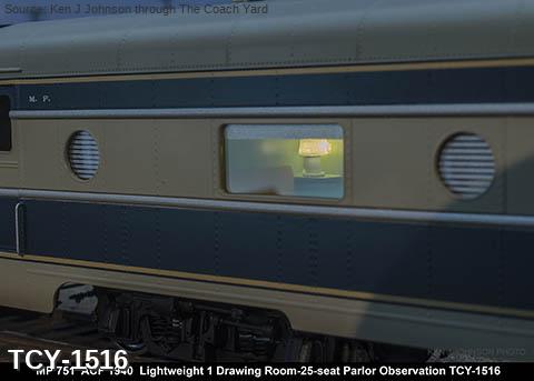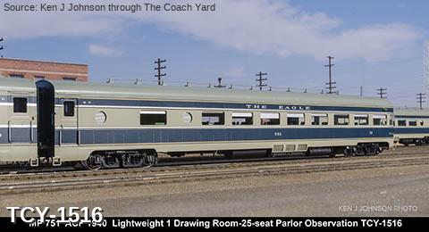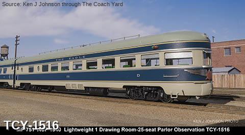 MP 'Missouri River Eagle' LW 6 car train, 1950s era, ACF built: Baggage #701, Baggage-Mail #711, Coach #721, 76 seat, Coach #731, 56 Seat, Diner-Bar-Lounge #741, Parlor Observation #751, FP Blue / Gray, LTD, INT NOTE: No engine